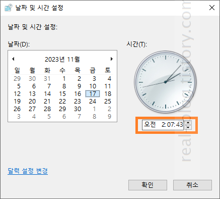 5) 날짜 및 시간 변경 화면에서 시간 조정 후 '변경' 버튼 클릭 (단, 여기에서는 초 단위 변경이 불가함)