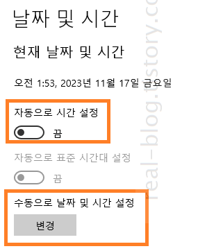 3) '날짜 및 시간' 조정창에서 '자동으로 시간 설정' 부분을 끄기 (끔으로 설정)