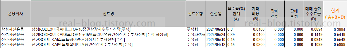 가장 오른쪽 열 [합계]는 판매/수탁/사무 보수(A) + 기타비용(B) + 매매중개수수료(D) 모두를 합한 값(%)입니다.