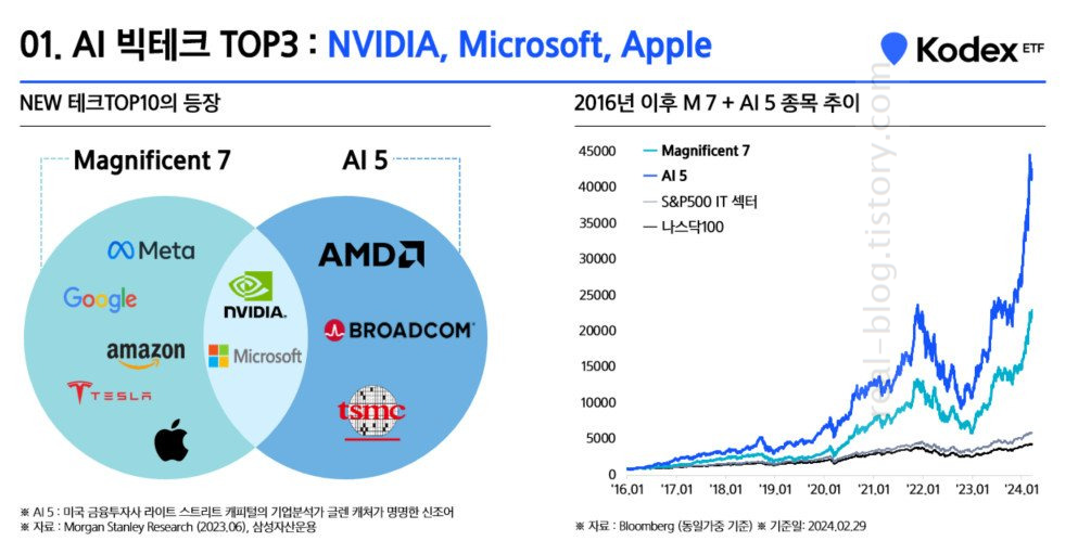 현재 AI 산업을 안정적으로 이끌고 있는 애플, 구글, 메타, 마이크로소프트 등 기존 빅테크 기업들뿐만 아니라 AMD, 브로드컴, TSMC 등 차세대 반도체 강자들도 가파른 성장세를 보일 것으로 예상되는 가운데, 이러한 기업들에 한 번에 투자할 수 있다면 어떨까요?