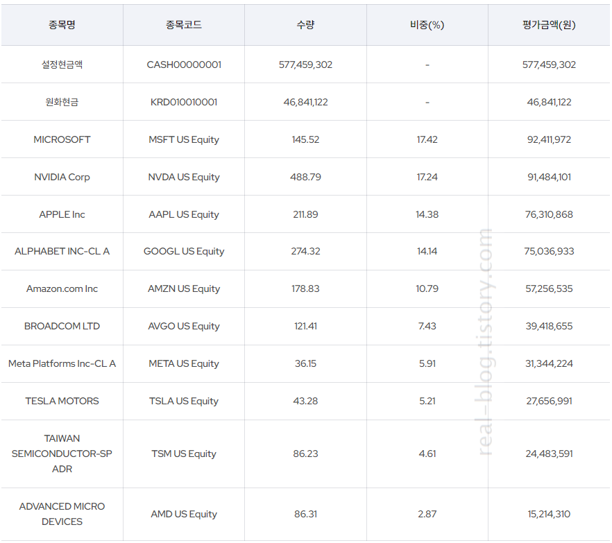 - 산출방법: 시가총액 기준으로 우량 테크주를 선별한 다음, AI 관련 기업 데이터를 수집/분석/학습한 LLM을 통해 조건에 맞는 종목 및 비중을 산출